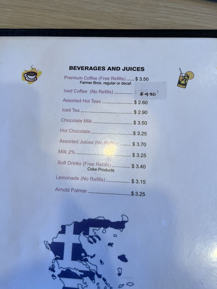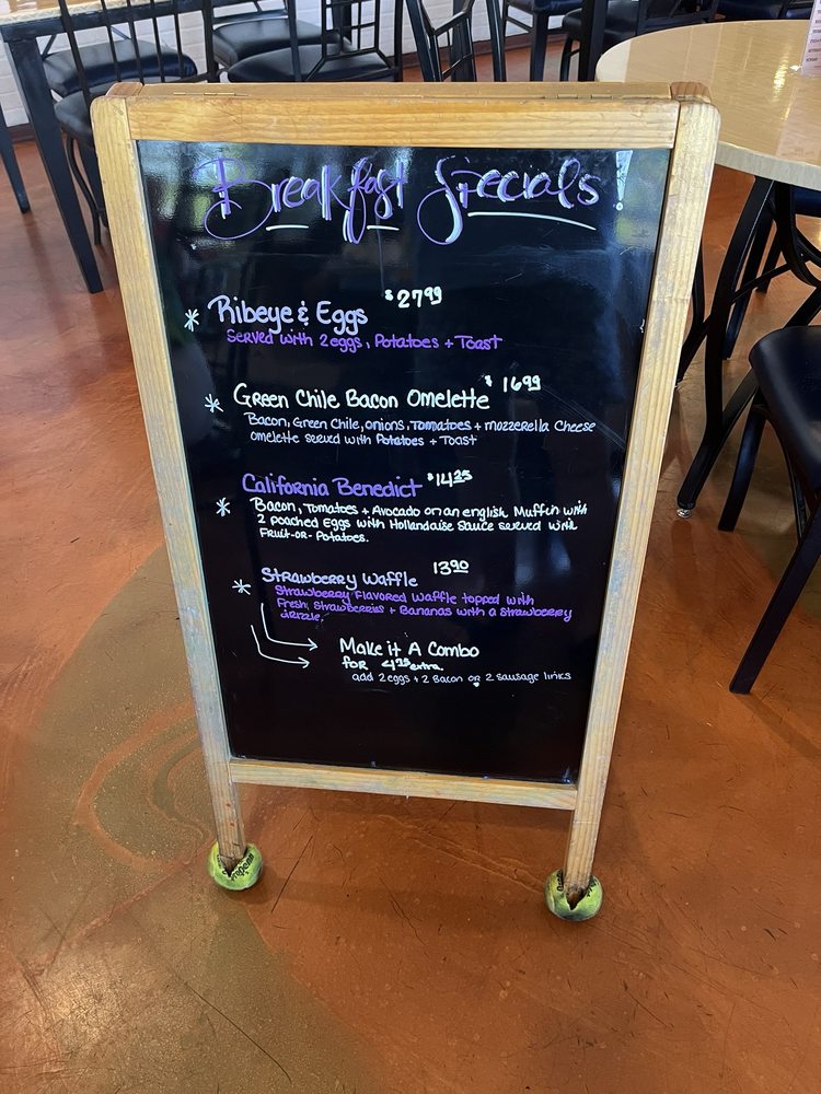 Two slices of thick texas toast, dipped in egg batter and griddled until golden brown. add eggs and your choice of links or bacon strips for $.